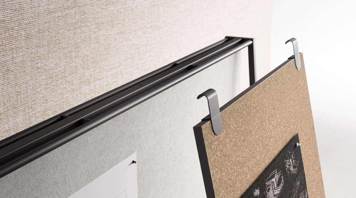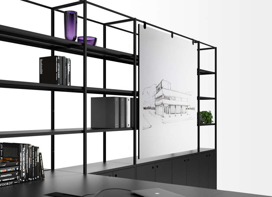 El tablón se engancha directamente en la estructura metálica tubular de la estantería y del tablón móvil. Se puede usar tanto en el lado cubierto de corcho como en el lado laminado de escritura y limpieza. Fotos, documentos y muestras de materiales, notas y objetivos están siempre a mano. El tablero móvil permite de añadir un segundo tablero movible.